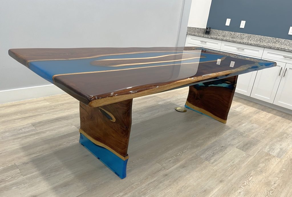 This table is being used as a conference table for a local Naples contractor. An epoxy river table begins with beautifully figured pieces of hardwood, its organic live edges keeping the tree’s natural shape and character intact. The slabs were carefully milled, dried and finished to highlight the rich grain patterns, knots and texture that only real wood can offer. To bring a modern and dramatic contrast, we introduced a deep “river” of blue epoxy resin through the center, allowing the wood’s edges to play off one another across the glossy channel.