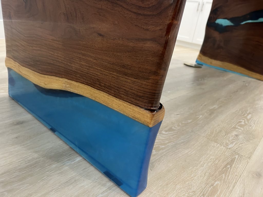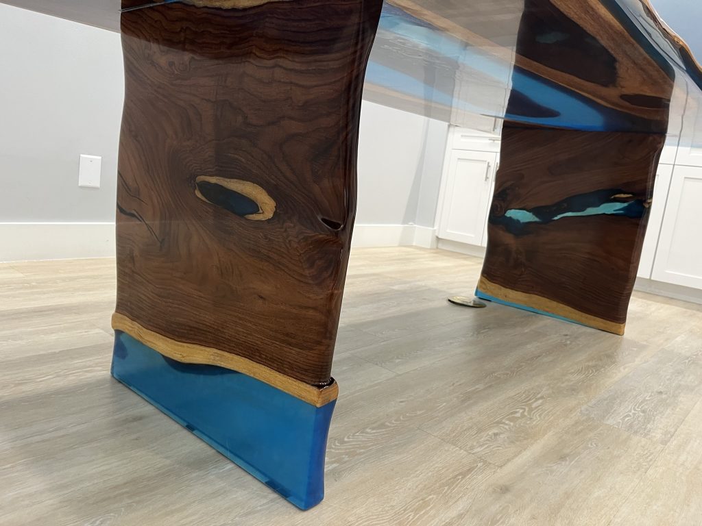 - Custom epoxy resin “river” that bridges the two edges and preserves the view through the table